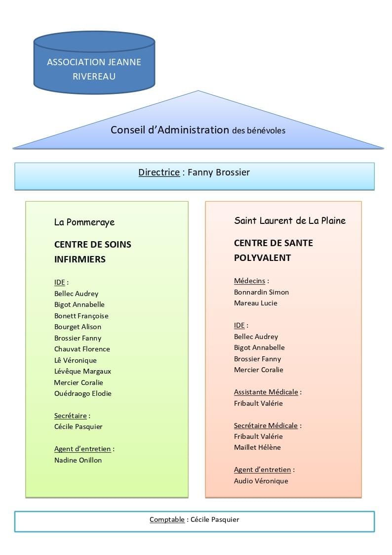 Le centre de santé est géré par l'association " Jeanne Rivereau", à but non lucratif, régie par la loi 1901. Elle est composée d'un conseil d'administration de membres bénévoles issus du territoire d'intervention. Ils se réunissent régulièrement avec la responsable de l'équipe pour suivre au plus près la vie du centre, donner son avis et prendre les décisions nécessaires à sa bonne gestion.